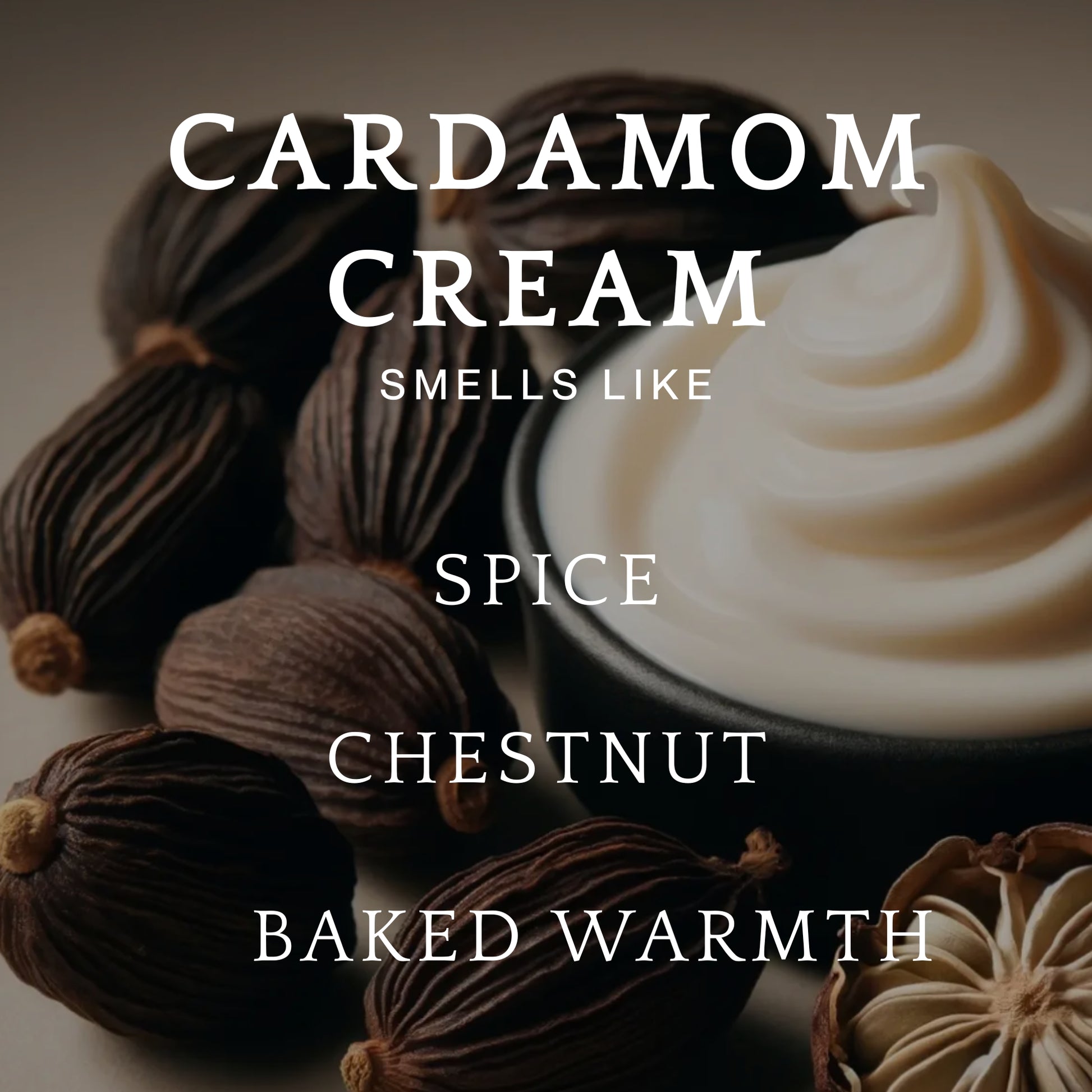Warm cream, spiced cardamom, and a hint of roasted chestnut. Smooth, cozy, and just sweet enough, like your favorite holiday dessert fresh from the oven.
